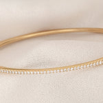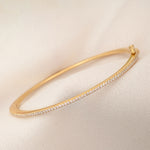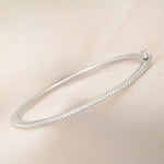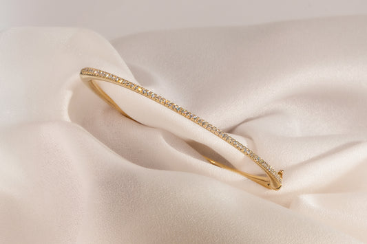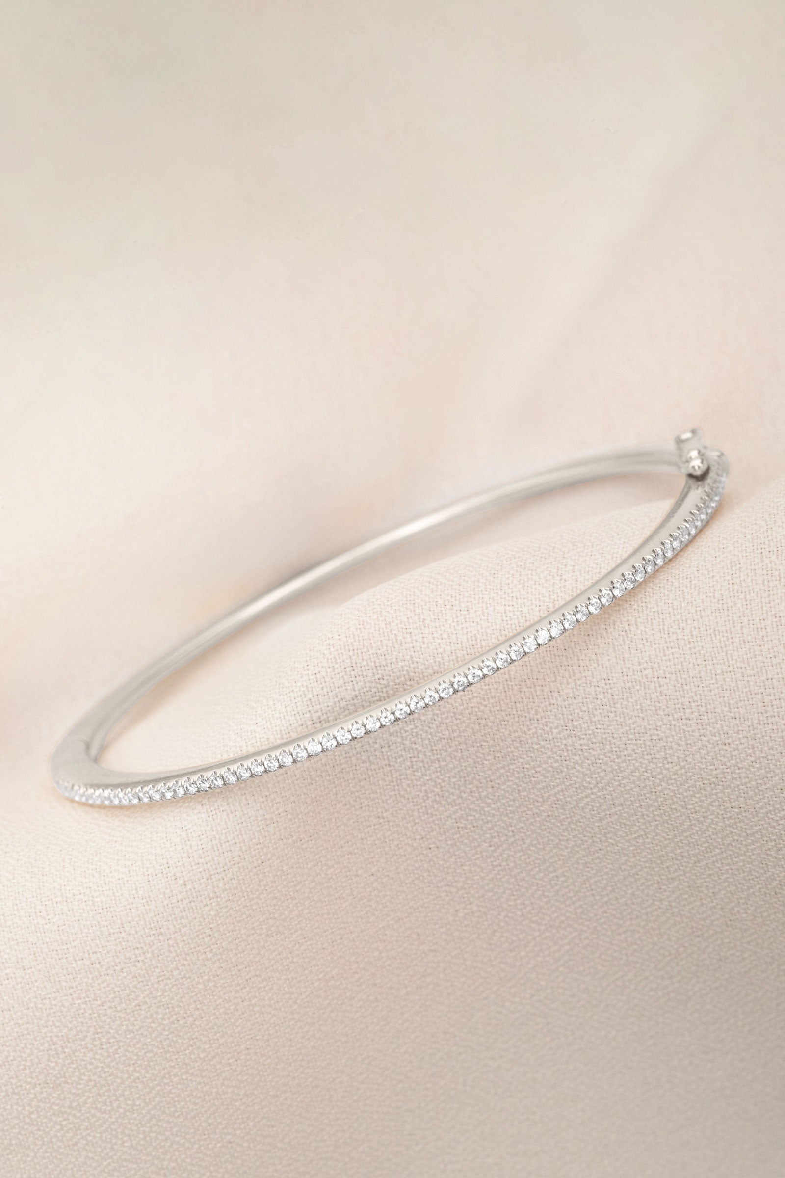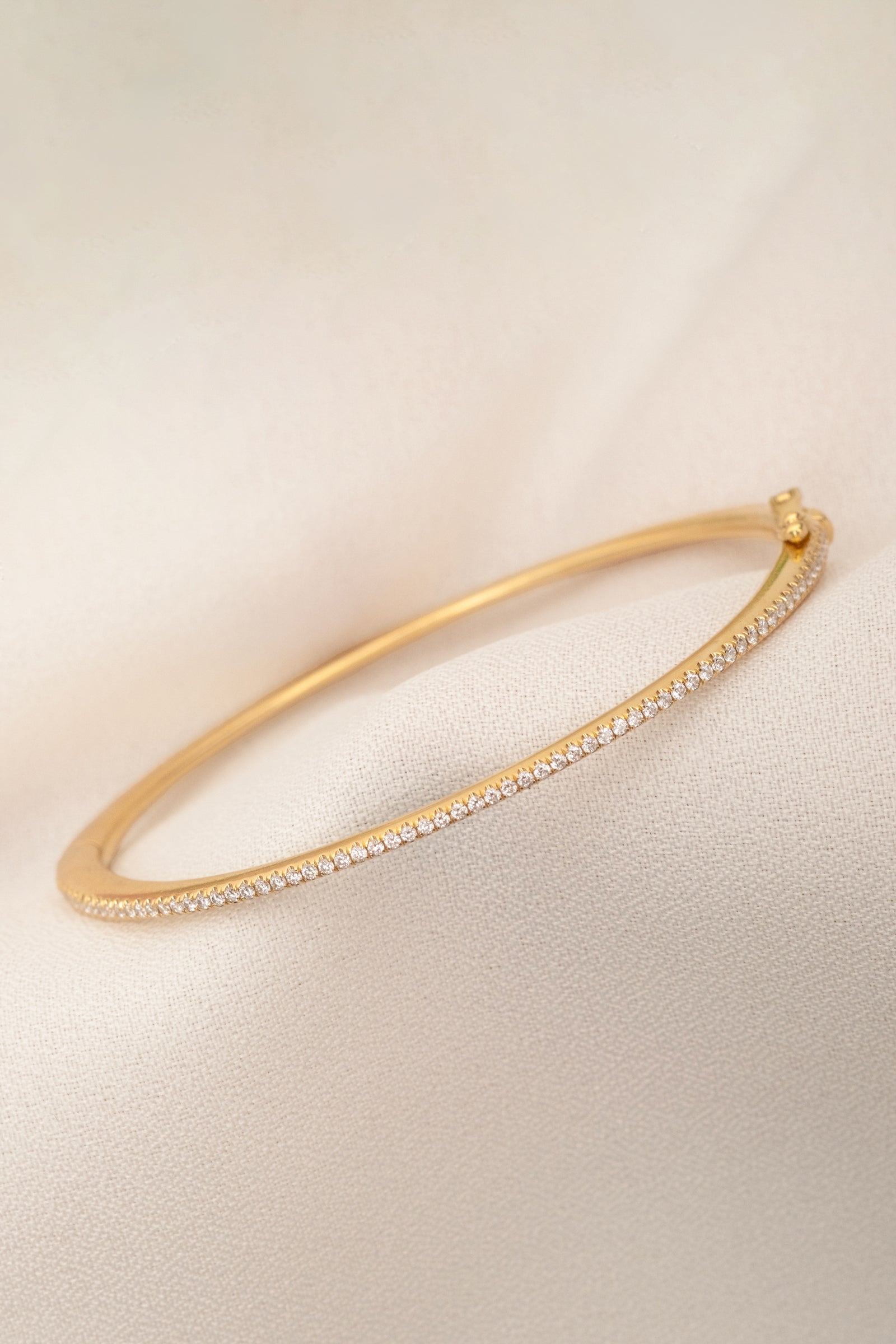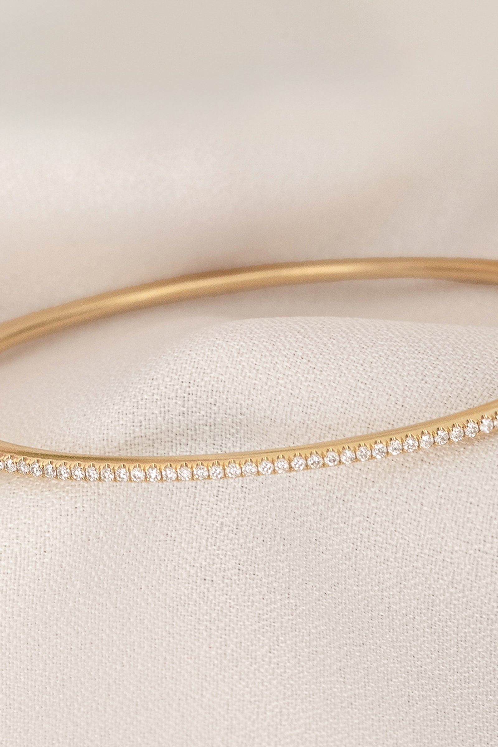 The bangle features a contoured oval silhouette that subtly tapers at the center and widens toward the sides—making it slim yet strong. The thicker sides ensure that the bangle has no give, while the tapered top creates a delicate appearance on the wrist.
